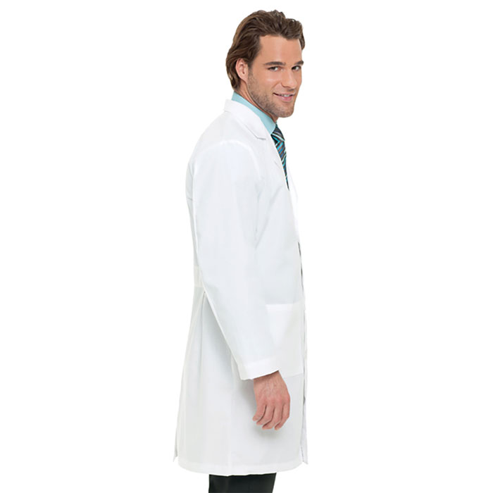 This full length, four button lab coat is complete with 3 front pockets and side hand access that perfect this wardrobe essential. Medium length 39 1/2" (size 40).
